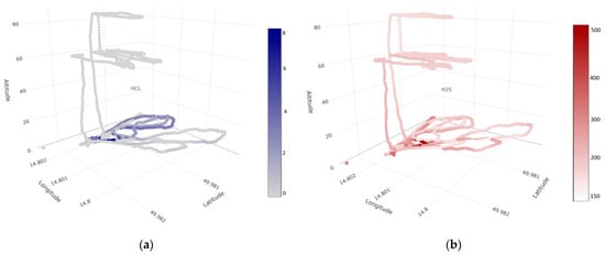 3D models present the most sensitive sensors during data collection: (a) HCL sensor and (b) H2S sensor measured by electronic nose.