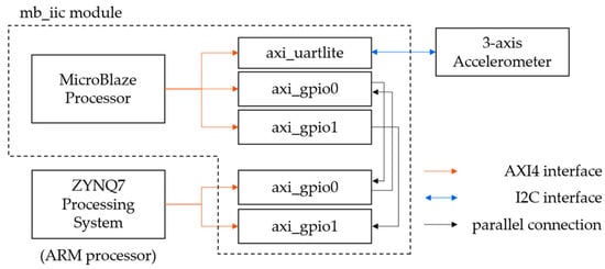 Block diagram of the Zynq chip adopted in the vibration measurement system; this sensor has two FPGA-based MB processors to obtain vibration and position data. MB processors are controlled by the ARM processor on the ZYNQ7 Processing System.