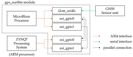 Figure 2 shows a block diagram of the mb_iic module. The mb_iic module is equipped with an MB processor, which controls the 3-axis acceleration sensor. The general-purpose input/output (GPIO) connected to the MB processor and the GPIO connected to the ARM processor are linked through parallel ports allowing data exchange. When a start command is sent from the ARM processor, the MB processor acquires the values of the 3-axis acceleration sensor. It then writes those values to the GPIO along with the launch command. The ARM processor then receives the startup code and data. Figure 3 also shows a block diagram of the gps_uartlite module. This processor receives serial data from the GNSS unit, edits the data, and passes the data to the ARM processor via GPIO.