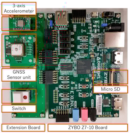 A photograph of this vibration sensor system is shown in Figure 4. The accelerometer ADXL355 and the GNSS unit are installed on the extension board. This board is connected to the ZYBO Z7-10 board through PMOD connectors, as shown in this photograph. This sensor system is slightly over-specified when considering only the vehicle vibration measurement.