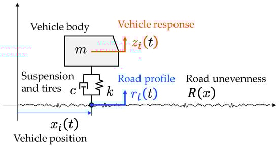 The vehicle system can be modeled as a simple mass-spring-dashpot system [4,5,6], shown in Figure 5. The vehicle mass, , includes the total mass of the vehicle body, tires, suspension, engine, fuel, other mechanical parts, and passengers. The spring and damping coefficients, and , respectively, mainly represent the performance of the vehicular suspension.
