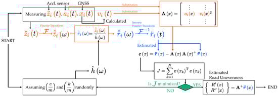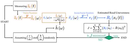 The algorithm is shown in Figure 6. First, the vehicle acceleration vibration, , is measured and the parameters and are randomly assumed. By substituting these data and properties into Equation (5), the road unevenness, , can be obtained. Let be the mean of :