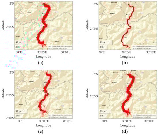 Figure 8 shows a photograph of one of the target buses. The sensor system was fixed to the floor inside the bus. The sensor system consists of an accelerometer and a GNSS unit. While the vertical acceleration vibration, , and the acceleration/deceleration, , are obtained from the accelerometer, the vehicle position, , and velocity, , are calculated from the latitude and longitude information obtained from the GNSS unit. The routes of the buses are also shown in Figure 9. The distance from the start to the endpoint is about 21.6 km. The jagged red lines on the maps indicate the vertical acceleration responses, , of the buses. The route of this field experiment is paved highway near Kigali city, Rwanda. On the day of the experiment, it was sunny and the temperature was 27 °C.