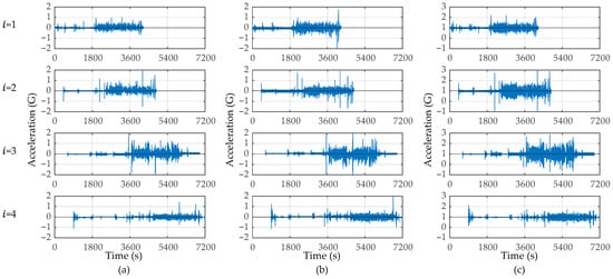 The measured vibration data: (a) acceleration of the travel direction, ; (b) acceleration of the lateral direction, ; (c) acceleration of the vertical direction, .