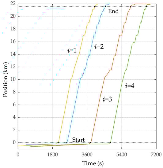 The – curve of each bus; the departure and arrival times of each bus are indicated by black dot markers. The slope of each curve represents the running speed. Note that is the distance, not a coordinate.