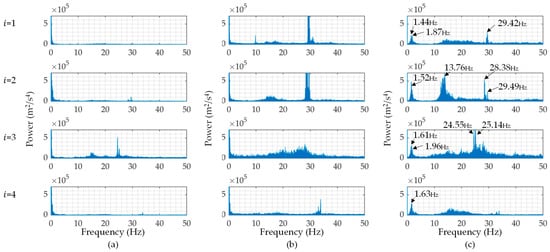 The Fourier’s power spectra of the measured vibration data. Each horizontal axis indicates the frequency, (): (a) travel direction, ; (b) lateral direction, ; (c) vertical direction, .