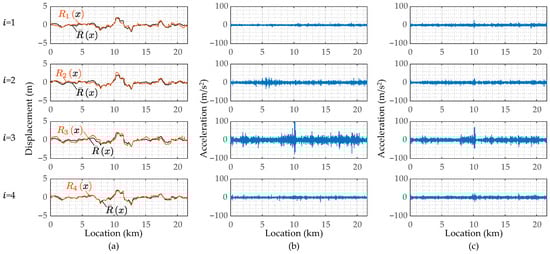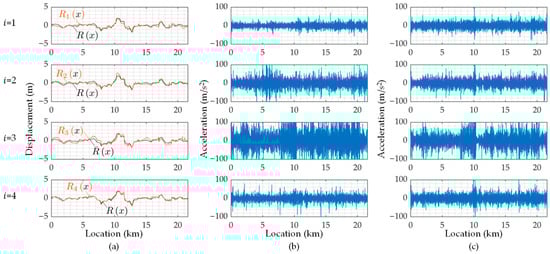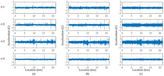 The spatially synchronized vehicle vibration data: (a) travel direction, ; (b) lateral direction, ; (c) vertical direction, .