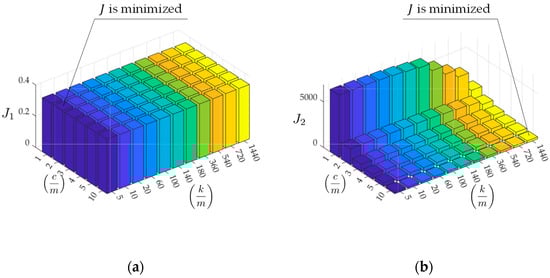 According to Figure 14, as the mechanical parameters and optimizing and differ, it is difficult to determine the mechanical parameters and from these results. According to an existing study [17], the function shape of is convex downward. However, those of and are monotonically increasing and decreasing, respectively. Thus, it is difficult to limit the search area for and .