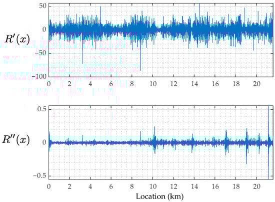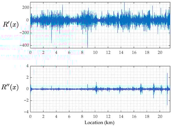 The methods presented in this study use the inverse FRF to estimate vehicle inputs, while Xue et al. [10] apply the Kalman Filter and Keenahan et al. [16] apply the Newmark-beta method. The first scheme for estimating road unevenness, , seems to work well. According to a previous study [16], when the estimated road unevenness match, they are close to the correct value. Therefore, it can be said that the estimated result is reliable. On the other hand, as the new suggested scheme can estimate the road unevenness slope, , and curvature, , the speed fluctuations of the monitoring vehicle can be considered in the process of the vehicle input estimation. However, its accuracy evaluation is also future work.