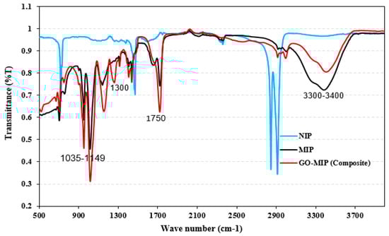 The ATR-FTIR spectra of the GO-composite, MIP, and NIP are presented in Figure 3 to understand the chemical compositions of the samples. The polyurethane system’s IR spectra are measured between 500 and 4000 cm−1. For DPDI, the C-H stretching vibration displays a peak at 2963 cm−1, the peaks at 1631, 1375, and 1200 cm−1 are allocated to the C=C, O-H, and C-O groups, respectively, and the peak at 1689 cm−1 is associated to the C=O group. For numerous groups, including the C-H group, the NIP, MIP, and GO-MIP spectra have persisted at peaks 2958, 2957, and 2957 cm−1, respectively. C-O is allocated at peak 1143 cm−1 and C=O associated to the peak 1716 cm−1 for NIP, respectively, demonstrating the presence of an EGDMA cross-linker. The presence of carboxylic acid groups has been established by the O-H bending vibration at 1375 cm−1. Success in polymerizing the NIP, MIP, and GO-MIP is demonstrated by the reduced intensity of C=C at peak 1631 cm−1. The disappearance of this peak (1631 cm−1) strongly suggests that the cross-linkers and monomers have formed a polymer [37]. Lower transmittance intensities of C=C stretching (1635 cm−1) and double-bond C=O bending (553 cm−1) are indicative of polymerization. While the absence of these peaks in NIP validates the removal of sugars, the typical peaks centered at 1035–1149 cm−1 indicate the existence of polysaccharides in MIP and GO-MIP (composite). During NIP synthesis, sugar was not added during polymerization. However, for the preparation of MIP and GO-MIP, sugar was added, allowing the polymerization under the conditions mentioned in the Materials and Methods section. Sugar (sucrose) has been removed by treating both fabricated sensors with di-ionized water with continuous stirring. As the sugar is water-soluble, it leaves the cavities complementary in size, shape, and geometry in the polymeric matrix (MIP and GO-MIP), but NIP did not possess these cavities because there was no sugar. Free radical polymerization may be the cause of the additional peaks. The stretching vibrations of sucrose’s -OH are responsible for the absorption peak at 3200–3400 cm−1, which supports the creation of hydrogen bonds, which is not evident in NIP. One or more weak aromatic rings were attributed to the peaks at 2800–2900 cm−1. By contrasting the peaks observed in MIP and GO-MIP, it has been discovered that NIP do not have them.