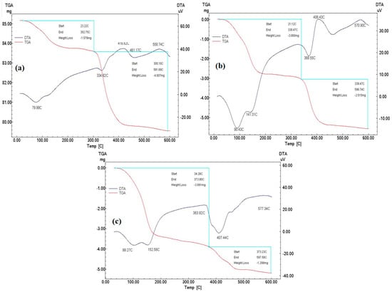 The thermogravimetric and differential thermal analysis (TGA/DTA) curves of (a) NIP, (b) MIP, and (c) GO-MIP are presented in Figure 4, with a temperature variation of 10 °C/min, and temperature range of 60 °C to 600 °C. The first weight loss occurred between 23.33 °C and 302.75 °C, resulting in an initial mass loss of −1.759 g. Dehydration process is associated with this temperature range, as illustrated in Figure 4a. The second stage has a temperature range of 305.10 °C to 591.69 °C with a weight loss of −4.007 mg. The subsequent breakdown of the chemical bonds in NIP is aided by this weight loss. The TGA/DTA curves of the MIP are depicted in Figure 4b with a weight loss of 3.06 g at 21.12 °C to 339.49 °C. The second weight loss of 2.515 mg has occurred between 339.47 °C and 596.74 °C. There is a −5.575 g overall weight loss in the MIP TGA curve. The temperature fluctuations in the GO-MIP TGA curves are shown in Figure 4c. In these curves, the first change occurs between 34.28 °C and 373.80 °C with a weight loss of −3.891 g, while the second change occurs between 373.80 °C and 597.58 °C with a loss of −1.298 mg. The entire weight loss of these curves, as shown in Figure 4c, is −5.189 g. These TGA curve results have shown that the MIPs, NIPs, and GO-MIPs employed for glucose sensing are extremely stable.