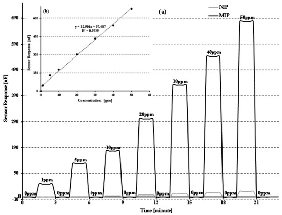 Fabricated inter-digital electrodes have been used to assess the sensitivity response of MIP and NIP (IDEs). From Figure 5, sensor behavior responds to the solution concentration in a linear fashion, i.e., response increases with increasing concentration. A thin-layer-coated IDE has been added to a solution containing 0 ppm of sucrose, and it exhibits extremely low sensor signals, showing the proposed sensor’s reversibility pattern. At 0 ppm, the observed capacitance is 0, and at 1 ppm, 5 ppm, 10 ppm, 20 ppm, 30 ppm, 40 ppm, and 50 ppm of sucrose, the sensor responses of 49 nF, 129 nF, 178 nF, 302 nF, 432 nF, 542 nF, and 679 nF have been observed, respectively, with the lowest limit of detection ~31 ppb of the fabricated sensor and newly fabricated sensor showing the linearity response of the sensor with a linear co-efficient of regression (R2) value = 0.99, as shown in Figure 5b. When exposed to liquids with different concentrations of sucrose, NIP shows very little sensor response. The sensor profile of sucrose molecules from 1 ppm to 50 ppm concentrations demonstrates the linearity of sensor signals as a function of concentration; this change in sensor signal is due to the change in the number of sucrose molecules incorporated in the sensor moieties. The -OH (hydroxyl) groups in sucrose may have been trapped in the molecular cavities of the polymeric matrix deposited onto the IDEs, increasing the sensor response (capacitance). Due to the existence of structurally linked cavities on the surface of MIP, the coated sensor produces a significantly stronger response as compared to NIPs. As a result, MIPs grow well-structured and geometrically acceptable cavities that permit the incorporation of template molecules only in specific locations. Figure 6 represents the incorporation and removal of analyte (sucrose) from MIP.