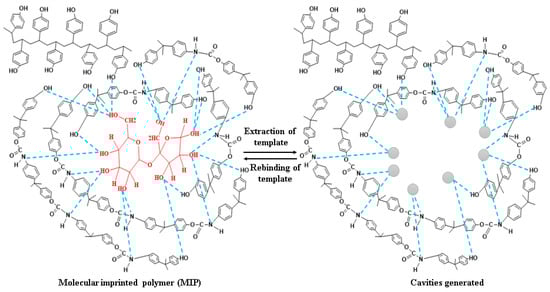 Molecular imprinted polymers [MIPs] are promising synthetic materials with recognition sites [27,28]. These recognition binding sites are highly specific to the target analyte than to other similar molecules [29]. MIPs are essential for electrochemistry to enhance the electrode response to the selected analyte [30]. These are highly attractive materials because of their highly selective properties [31,32]. The MIPs possess greater stability, easy and fast preparation, less production cost, and generation of three-dimensional (3D) cavities of specific shape, size, and special geometry of the target molecule [33]. Shortly, in MIPs synthesis, functional monomer and cross-linker are added in a suitable solvent to establish a monomer-template complex by any physical or chemical interactions [34]. Chemically, MIPs are synthesized by bulk process where reaction occurs in a homogenous mixture [35,36]. Chemical interactions occurring between monomer and analyte may be through a non-covalent bond that can generate cavities on the bulk of the MIPs [37,38,39,40,41]. Research progress on MIP sensors for the detection of sucrose has demonstrated promising results in recent years. MIP sensors utilize the specific recognition properties of molecularly imprinted polymers to selectively detect target molecules, in this case sucrose. These sensors have been shown to possess high selectivity, sensitivity, and stability for the detection of sucrose in various sample matrices and have the potential for utilization in a variety of applications [42,43].