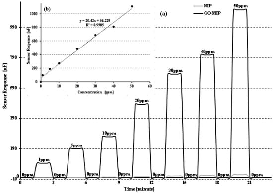 (a) Sensitivity response of GO-MIP composite and NIP of polyurethane-based sucrose sensor at different concentrations (0–50 ppm); (b) linear regression analysis of sucrose sensor.