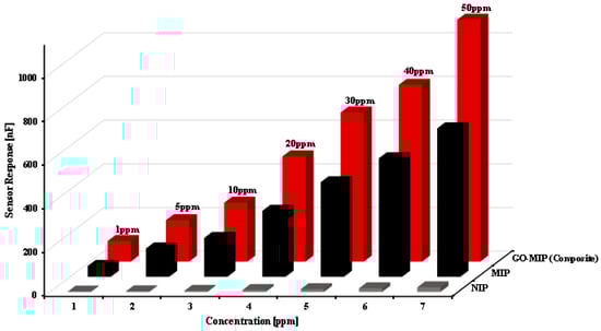 When the concentration of the template is increased, the sensitivity response is strong and the conductance changes, demonstrating a linear relationship between the concentration of the template and conductance, as illustrated in Figure 8. It returns to its initial value following the template’s removal with de-ionized water, demonstrating the sensor’s perfect reversibility and reproducibility. NIP, on the other hand, exhibits no appreciable change in reaction as a result of its lack of binding capacity to analyte. The ability of the template molecule to distinguish between numerous interfering species that have a similar electro-activity to the target analyte, the same shape, and a comparable oxidizing potential is one of the most crucial parts of building an electrochemical sensor. There may be hydrogen bonds and dipole–dipole forces between the template molecules and the polymer matrix, which interact with imprinted cavities. The ability of the template molecule to distinguish between different interfering species that have the same shape, a comparable oxidizing potential, and a similar electro-activity to the target analyte is one of the most crucial components of developing an electrochemical sensor. The bulk molecular-imprinting approach may be the root of any sensor’s improved responsiveness to a specific analyte.