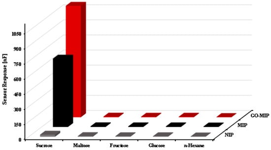 In contrast with MIP, a greater selectivity response has been observed in nano-composite and composite sensors. This is because of a higher surface-area-to-volume ratio. This demonstrates that the GO-MIP preparation exhibits remarkable selectivity for sucrose molecules. Due to the precise geometry, structure, orientation, and spatial arrangements that are created in composite (GO-MIP) during the synthesis condition to provide a selective cavity toward sucrose molecules, composite (GO-MIP) sensors exhibit less interference from other species in the presence of sucrose.