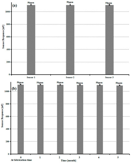 Reproducibility and stability are important parameters for the application of sensors. To study the reproducibility of a GO-MIP-composite-based sensor, three different sensors have been synthesized by using the same method and stored under similar conditions of temperature and pressure for one month. After a month, these fabricated sensors were exposed to a 50 ppm concentration of sucrose and their sensor response has been recorded, as shown in Figure 10a. The above-mentioned observations indicate that GO/MIP-composite-based sensor shows only a highly negligible decrease in sensor response with a relative standard deviation (RSD) of ~0.42%. Furthermore, for stability analysis of the GO-MIP-based sucrose sensor, a sensor is designed following the same procedure of synthesis and stored for a period of six months under normal conditions.