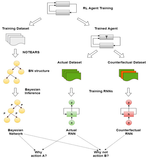 The literature that explores the explanation of policies and actions in an MDP context is extensive. In [26], a first attempt to generate explanations for MDP selects and uses relevant variables of states of factored MDPs, chosen by domain experts. Then, attention was brought to the generation of minimal explanations for MDPs using three domain-independent templates [27]. Moreover, policy explanations were created from summarized policies and provided contrastive explanations for counterfactual events [28]. Similarly to our approach, ref. [29] proposes to use DBNs for representing the transition function in factored MDPs, since learning DBNs in factored MDPs is a well known solved problem [30]. It is fundamental for the increased transparency of the machine to be able to create explanations for the counterfactual case, which simulates what could happen under different conditions. These answers will give a detailed explanation of the agent’s behaviour [22,31,32].