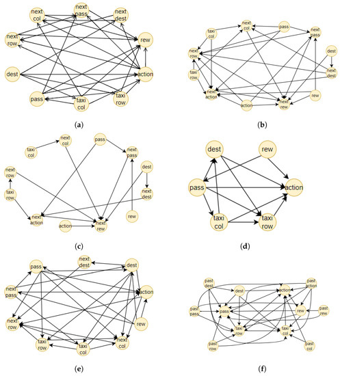 Comparison of causal graphs generated with different algorithms and parameters for Taxi environment. (a) BN Graph created by the NOTEARS algorithm with threshold parameter . (b) DBN Graph created by the DYNOTEARS algorithm with threshold parameter . (c) DBN created by the DYNOTEARS algorithm with threshold parameter . (d) Causal graph generated from Direct LiNGAM using only the actual state values. (e) Causal graph generated from Direct LiNGAM using both the actual state values and the next ones. (f) Causal graph generated from VARLiNGAM with the threshold for the actual relation and for the next time step .