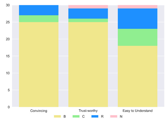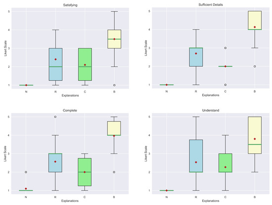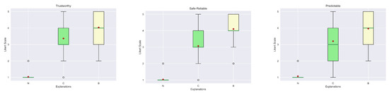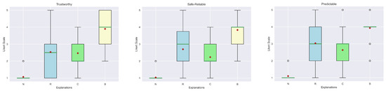 The last assumption that we need to check is the Homogeneity of variances when the data is not drawn from a normal distribution. To this end, we apply Levene’s test for the homogeneity [61]. As done previously, we reported the W-test statistic and the p-value calculated for each quality in Table A7 for the explanation of the “Why” question and Table A8 for the “Why not” scenario. The results of the calculations prove that we must reject the hypothesis of homogeneity as well since the p-values are always below the threshold of and also the W-test statistic confirms it since it is less than 152 (). Therefore, the assumptions for considering a parametric test, e.g., one-way ANOVA and consequently, an associated post-hoc test, e.g., Tukey’s Honest Significant Difference (HSD), do not hold. Hence, the other possible choice is to consider a non-parametric test like the Kruskal–Wallis test and the post-hoc Dunn’s test.