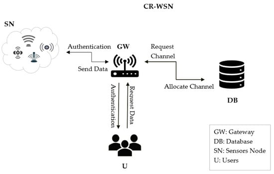 The design of our proposed protocol depended on developing lightweight secure cognitive radio-enabled wireless sensor networks by integrating both WSN and CRN technologies. The integration process is shown in Figure 2. The model consisted of users Us, a gateway (GW), a sensor node (SN) as a cognitive user (CU), and a database (DB). Therefore, the GW provided a security mechanism, such as a shared key for the sensor and user over a secure channel. Then, the GW authenticated both the sensor and user. Moreover, it communicated with the DB to allocate the channels and provide them for the sensors and the users. The sensor collected the data and sent them to the GW. After that, the user could access the gateway to monitor the sensed data. The secure MAC protocol in the CR-WSNs using a lightweight authentication protocol comprised four phases: the registration phase, consisting of the sensor node registration phase and user registration phase, the login and authentication phase, the control channel exchange phase, and the data exchange phase. The framework helped to technically model the functional requirements of the system by remodeling them into understandable diagrams. We next outline the system model, consisting of the model protocol components and users. Figure 2 shows the framework of the proposed protocol, as follows: