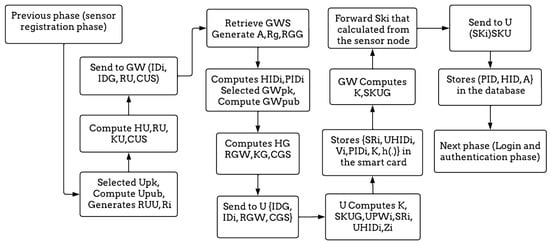 Step 3: Now, both the user and the gateway can calculate the shared key SKUG, which is derived from the ECC. The GW forwards the session key to the user to use when encrypting data. On the other hand, the user computes UPWi = h (PWi Ri), SRi = Ri (IDi PWi), UHIDi = HIDi h (PWi IDi Ri), and Zi = h (UPWi IDi Ri) and then stores {SRi, UHIDi, Vi, PIDi, K, h(.)} in the smart card. For further details, Figure 4 summarizes the whole process of the user registration phase.