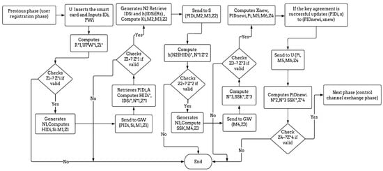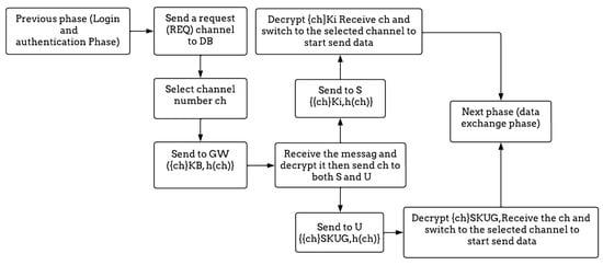 After the mutual authentication process is completed successfully, the gateway requests a channel number from the database and sends it to the user and sensor. For further details, Figure 5 summarizes the whole process of the login and authentication phase.