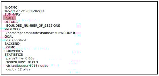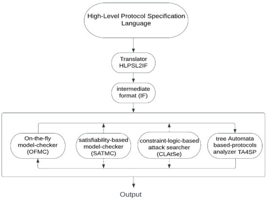 Figure 8 shows the AVISPA tool architecture. To start, a text is written in CAS+ language and given as input to SPAN, which in turn will convert it to an HLPSL text [34]. Then, this text is entered into the intermediate format (IF) translator, which in turn directly converts it to an intermediate format (IF) by using the translator HLPSL2IF [34]. Then, it analyzes it by using one of four backends existing in the AVISPA tool: the on-the-fly model-checker (OFMC), the constraint-logic-based attack searcher (CLAtSe), the satisfiability-based model-checker (SATMC), and the tree automata based on automatic approximations for the analysis of security protocols (TA4SP) [34,35]. One of the selected backends executes the protocol during a number of iterations until it determines that the protocol is secure or an assault is found, in order to check all the targets previously defined in the HLPSL targets section. The AVISPA tool is very flexible because it enables the user to use it in two diverse ways; the first is through the AVISPA security protocol animator (SPAN), a program with a very easy-to-use graphical interface simulating the encryption protocol. The second method is through calling the default command-line options of the automated validation of the internet security protocols tool [34]. Specifically, the first method SPAN was adopted with the OFMC backend because it contained XOR operations in the proposed protocol.