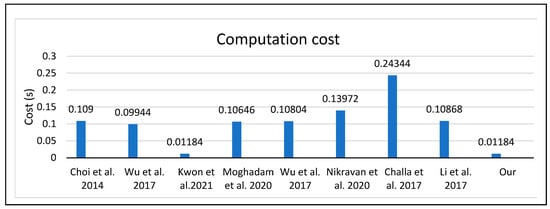 Table 11 and Figure 10 demonstrate the computational cost comparison of the proposed and some related protocols. The computational cost was calculated at the login and authentication stage. The total cost of the proposed protocol equals the total cost delivered, as defined by the research work presented in [4], which was equal to 0.01184 at the login and authentication phase; the reason for this, as shown in Table 11, was that the two protocols were equal in the number of hashes, 37Th, but the operations in the proposed protocol differed completely in several other stages from [4], for example, the sensor registration phase, the user registration phase, the control channel exchange phase, and the data exchange phase.