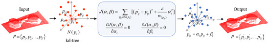 where, and are linear model parameters limited by the preset neighborhood, which can be calculated by minimizing the cost function . The reflects the difference between the output point cloud and the input point cloud , the is formally defined as below: