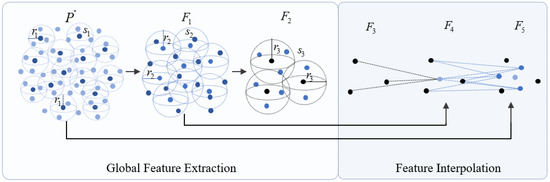 The extracted with hierarchical clustering and multi-scale features is enough to describe the global features, but it still lacks detailed features when used for segmentation. In order to consider the description ability of the detailed information, features are expanded, including feature interpolation and feature splicing. First, based on , the IDW interpolation method based on the KNN is used for upsampling to achieve the purpose of supplementing details. The basic principle of IDW interpolation is that points that are closer to each other are more similar than those farther apart.