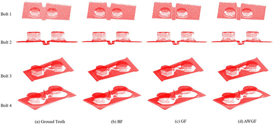 In order to compare the performance of the denoising and smoothing algorithm AWGF in this paper with the BF algorithm and the GF algorithm, a comparative experiment was conducted on four bolts in the dataset. The corresponding number of bolts is shown in Table 2, and the time comparison experiment is shown in Table 3. Figure 6 shows the contrast details.