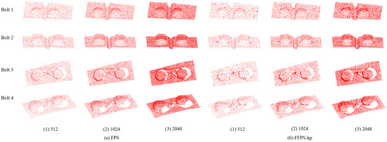 In order to compare the performance of the proposed algorithm FFPS-kp with FPS, four bolt point clouds were selected from the datasets for the downsampling comparison experiment, and the sampling numbers were set as 512, 1024, and 2048, respectively. The number of sampling points and the corresponding sampling time are listed in Table 4 and Table 5; the effect after sampling is shown in Figure 7.