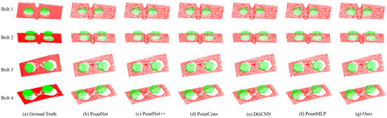 In order to evaluate the performance of the proposed network architecture on the bolted point cloud segmentation task, we selected several popular point cloud segmentation algorithms, PointNet, Pointnet++, PointConv, DGCNN, and PointMLP to make the comparison. To reduce the calculation consumption in the preprocessing part of the experiment, the actual dense bolt point cloud was downsampled, and 2048 points were reserved for feature extraction. Table 6 shows the comparison of segmentation accuracy, IoU, and mIoU. Figure 8 gives the comparative graph of segmentation results of different deep learning algorithms.