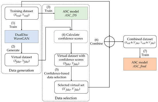 We first train an ASC model ASC_DS using the real data (animal sound data) Xreal and their categories (animal class label) Yreal, based on the cross-entropy loss. This ASC model can distinguish the unique features of each real animal sound, and hence, a clearer semantic information of the input sound will aid the model in correctly classifying the corresponding class. Therefore, we use ASC_DS to infer the probability of the generated virtual data Xfake for each class, and based on this probability, we determine the confidence score for the virtual label Yfake. If the virtual data have a high confidence score, then they have characteristics similar to those of the real data. For each class, we select the virtual data with high confidence scores and use them to augment the training data for the final ASC model ASC_final, as shown in Figure 1. These training data are then used to train the final ASC model.