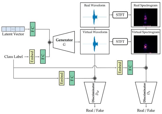 Due to the limited availability of traditional augmentation methods, GAN-based models have attracted considerable attention as data augmentation tools in the signal data domain. For instance, Esmaeilpour et al. [18] suggested a weighted cycle-consistent GAN (WCCGAN) for spectrogram augmentation. Their method transfers the structural features of source spectrogram to target spectrogram, generating deformed data. They showed that the accuracy of two classifiers trained with augmented data by WCCGAN improved significantly on four environmental sound datasets. Madhu and Suresh [19] developed an unconditional GAN-based augmentation model by adding two layers and one stable loss function to WaveGAN [20] to generate longer virtual waveforms suitable for representing environmental sounds. However, this approach requires a class-specific generative model to generate class-specific data properly in a multi-class environment. Consequently, as the number of sound classes increases, the time and effort required for model construction also increase.