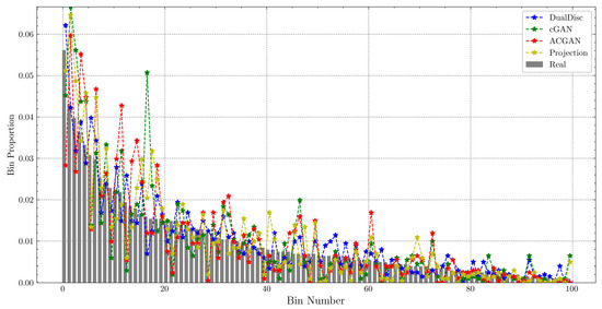 Bin proportions of the real and virtual data of all the classes. The number of bins, K, is 100. Projection indicates Projection-cGAN, and DualDisc indicates the proposed DualDiscWaveGAN. The bars represent the bin proportions of the real data, and the dash-dotted lines represent the bin proportions of the virtual data generated by each model.