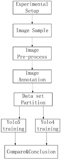 An overall flow chart of spark image processing is shown in Figure 5. First, an experimental platform was set up, as shown in Figure 1, and data acquisition was carried out for the frontal and side spark images. Then, the spark images were preprocessed. The target detection area was obtained by annotation with LabelImg. The spark images were divided into a training set and a test set, with 90% of images assigned to the training set and 10% assigned to the test set and trained with YOLO5 and YOLO4, respectively.