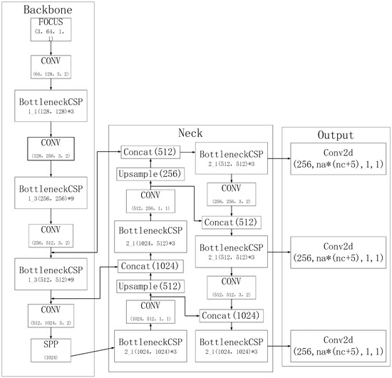 The YOLO5 model consists of four versions—YOLOv5s, YOLOv5m, YOLOv5l, and YOLOv5x—with successively higher model parameters and performance. YOLO5 maintains the network structure of input, backbone, neck, and head outputs, as shown in Figure 6.
