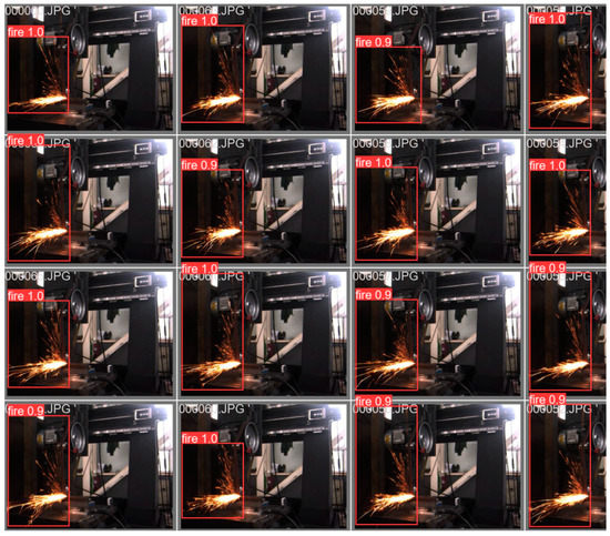 As shown by the above curves, the accuracy of the frontal spark images after training was up to 0.995 when mAP@0.5. After training, the side spark images, when mAP@0.5, the accuracy was up to 0.995. After 300 rounds of training, cls_loss, box_loss, and obj_loss all dropped below 0.01 according to the curves presented in Figure 16.