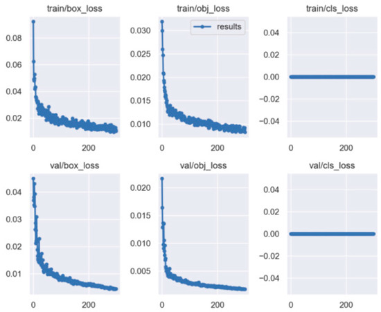 The loss is divided into three parts in the training process: cls_loss, box_loss, and obj_loss. cls_loss is used to supervise the category classification, box_loss is used to supervise the regression of the detection box, and obj_loss is used to supervise the presence or absence of objects in the grid [30,31].