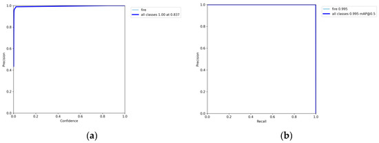 (a) Precision–confidence curve for YOLO5 frontal spark images. (b) Precision–recall curve for YOLO5 frontal spark images.