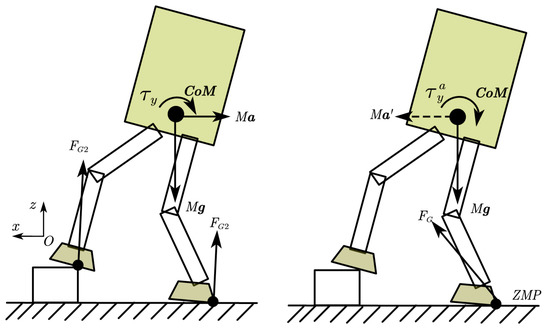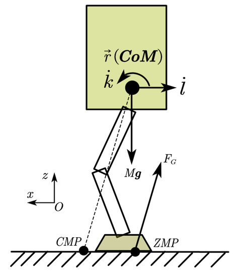 where is the total moment acting on the CoM, and is the ground reaction force. In a normal linear inverted pendulum model (LIPM), the height of the center of mass does not change, and the change of angular momentum of the robot is neglected. Therefore, Equation (1) can be written below: