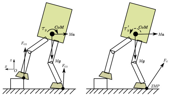 According to Newton’s laws of motion, the rate of change of angular and linear momentum at the CoM, and , is equivalent to the resultant effect of all external forces [23,24]. Figure 1 shows the external forces that act on the standing robot: the ground reaction force and the weight of the robot.