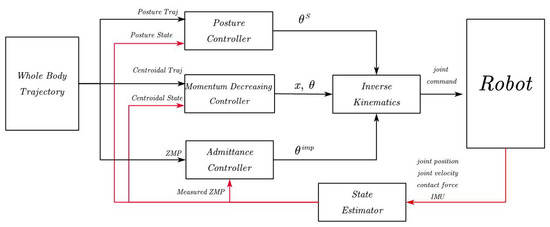 Overall control framework. In the single and double support phases, different controllers are enabled for trajectory control. The momentum decreasing controller and the admittance controller are enabled only in the double support phase. The red line represents the feedback states.