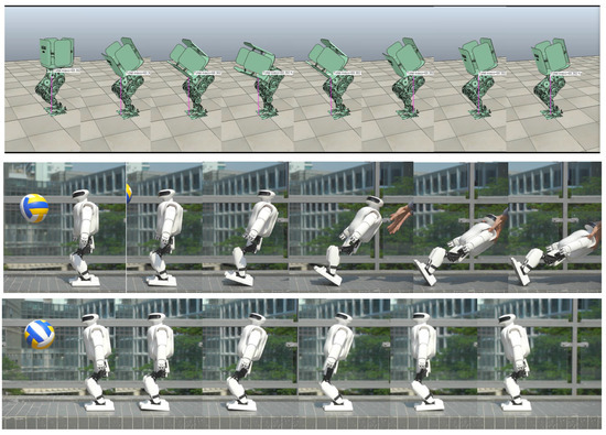 We tested the disturbance resistance of the robot in a standing state using the angular momentum compensating linear momentum method. In the simulation, a humanoid virtual prototype with a 60 kg weight and a 1.3 m height was pushed by a 400 N force lasting for 0.1 s and recovering in 2.0 s. In the hardware test, the robot was hit by a volleyball with speeds ranging from 6.5 m/s to 5.3 m/s in multiple tests. Figure 7 shows the simulation and hardware test results. Below is the detailed analysis of the hardware test.