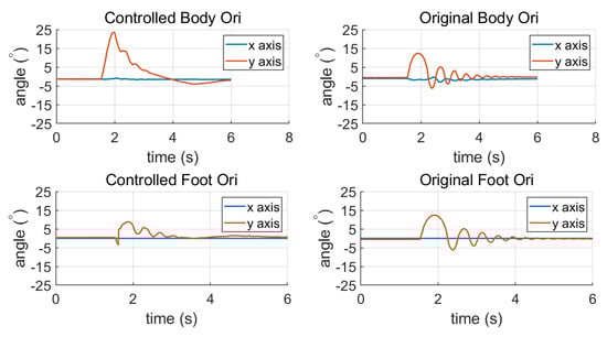 We can see from Figure 8 that when the momentum allocation control is adopted, the robot does not sway back and forth; instead it smoothly restores to a steady state. The max sole orientation error is decreased, indicating that the allocation control decreases the impact effect.