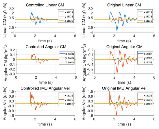 The linear and angular momentum change of standing balancing. Both the linear and angular momentum are decreased after the allocation control. The maximum angular velocity of the torso is also reduced because of the rapid stabilization process.