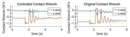 Although the posture controller can restore the trunk posture to a certain extent, the robot still easily falls when a major impact suddenly occurs. When the robot’s foot touches the ground before the scheduled time or the foot steps on a protruding object, there will be a large impact produced in the contact position [25], which will significantly affect the robot’s locomotion. Therefore, the momentum allocation controller and the posture controller alone cannot keep the robot walking stably. In order to reduce the landing impact and make the landing process compliant, we used an admittance control on the sole of the robot’s feet.