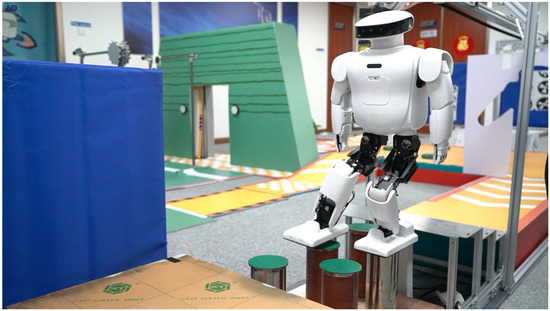 We tested the discrete terrain walking control with two rows of circular support columns, as shown in Figure 11. Due to the limited contact area between the foot and the support column, the robot easily falls. Using the linear momentum compensation method, we improved the success rate of the experiment from about 40% to about 90%. The test process was to run the test program 20 times under the same start conditions.